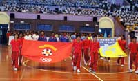 Myanmar Football Federation held Futsal Demonstration and Competition at the Thuwunna National Indoor Stadium (1) at 1 pm on August 14,2005. Present on the occasion were Myanmar Olympic Committee Chairman, Minister for Sport, Brig-General Thura Aye Myint, Patron of Myanmar Football Federation, Yangon Mayor Brig-General Aung Thein Lin, Myanmar Football Federation President U Zaw Zaw and Committee members and invited guests. The presenters were Kyi Thar (Pwe Kyaik Khin), Ahrine and Poe Pyu. Former Myanmar Selected Team players, Than toe Aung, Tin Myint Aung, Aung Kyaw kyaw, Kyi Lwin and Myo Hlaing Win demonstrated the Futsal game and the referee U Tun Hla Aung explained the Futsal rules during the competition. Youth players from Institute of Sport and Physical Education were divided into Teams (A) and (B) and played Futsal game. Then the former Myanmar selected team players were divided into two teams and their match ended with 12-10 and won by the team led by Than Toe Aung. After the match, Myanmar Football Federation President U Zaw Zaw rewarded Ks- 50000 to the best player Myo Hlaing Win who scored 7 goals. Mayor's Cup Futsal Football Tourney will be held in October in order to develop Futsal games and the teams that are interested to take part have to join MFF.