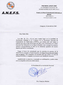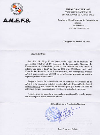 "We are so happy !" www.futsalplanet.com won the prestigious prize of the Spanish Coaches Association for the best futsal promotion in the web